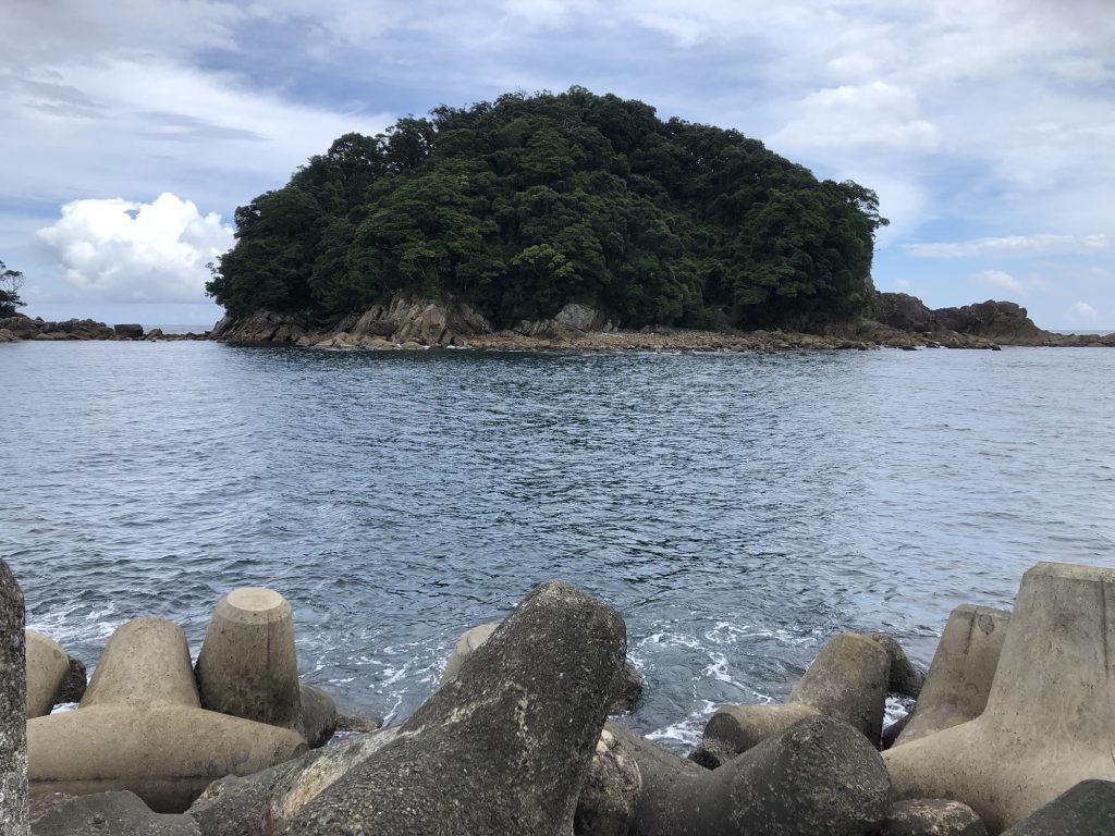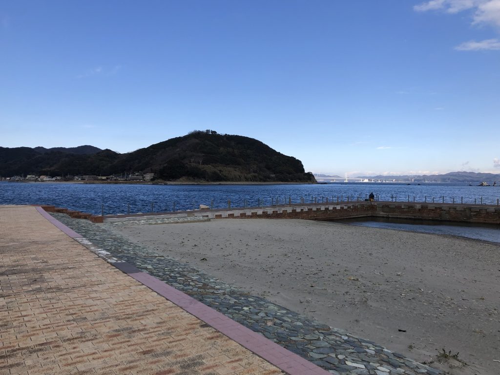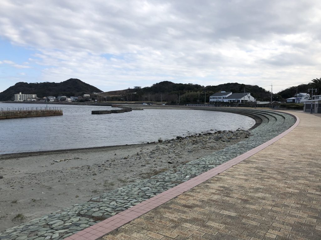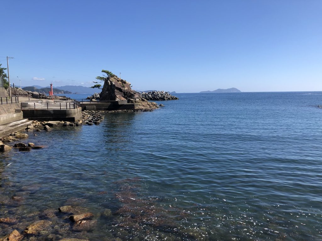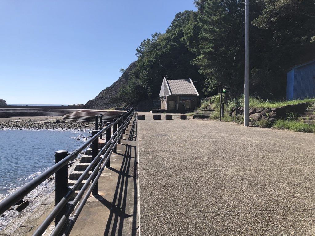 海水浴場はこんな感じ。海水浴場なんで内向きは浅い。駐車スペース、トイレも有り、近くには自動販売機も設置されている。