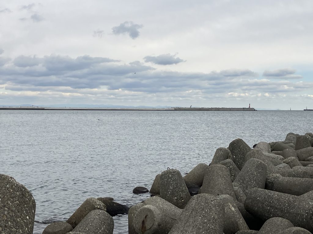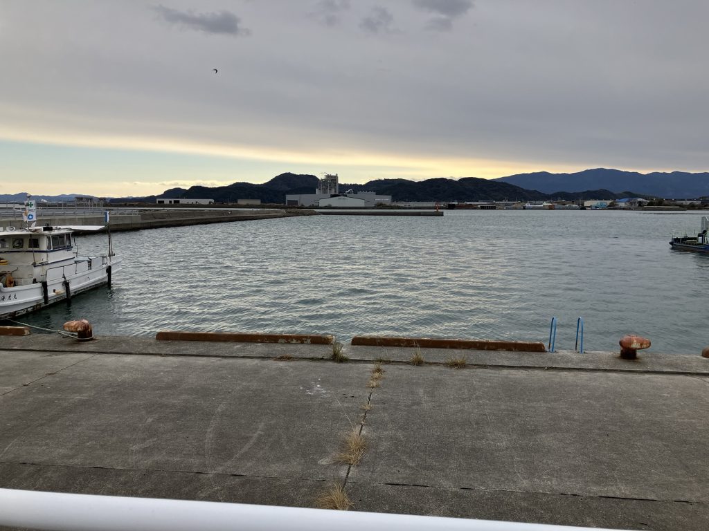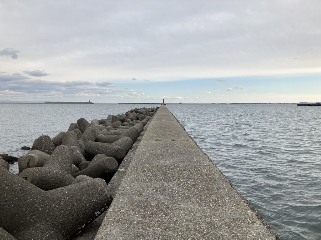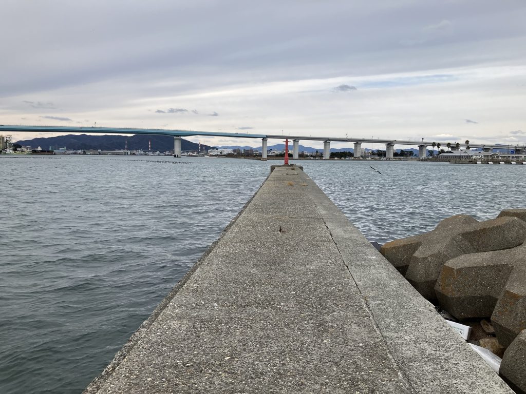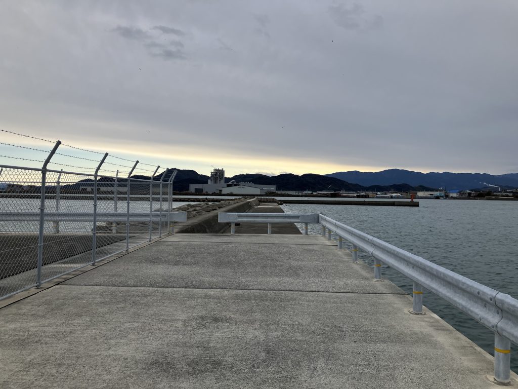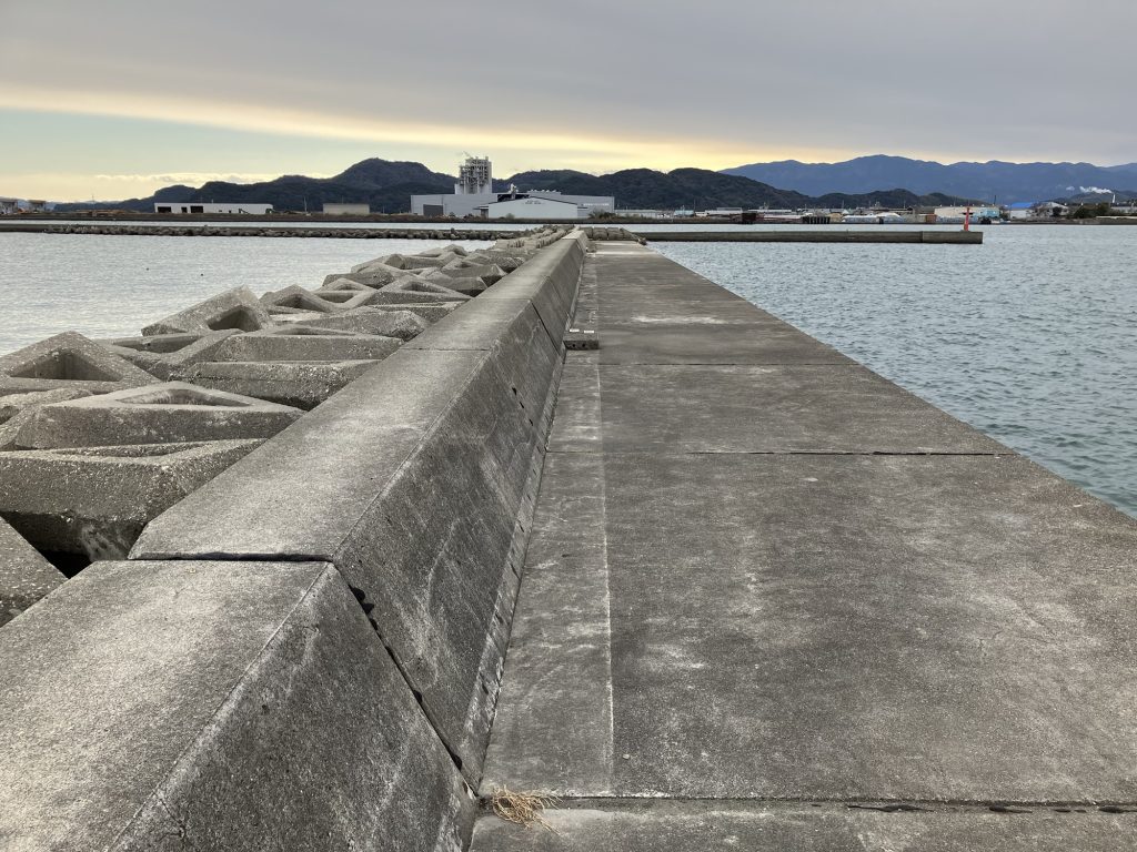 L字波止の西側。こちら側で釣りをしている人は少ない。そりゃ普通に考えれば下流の東側で釣るわな。