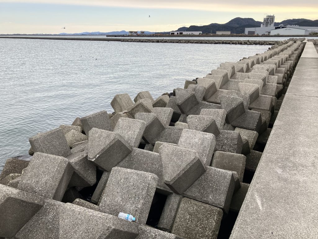 反対の内向きのテトラポット。ここでもチヌ・キビレの魚影は濃い。メバリングも人気。常夜灯が無いので夜釣りは十分注意しなければならない。ライフジャケットは必須ですよ。