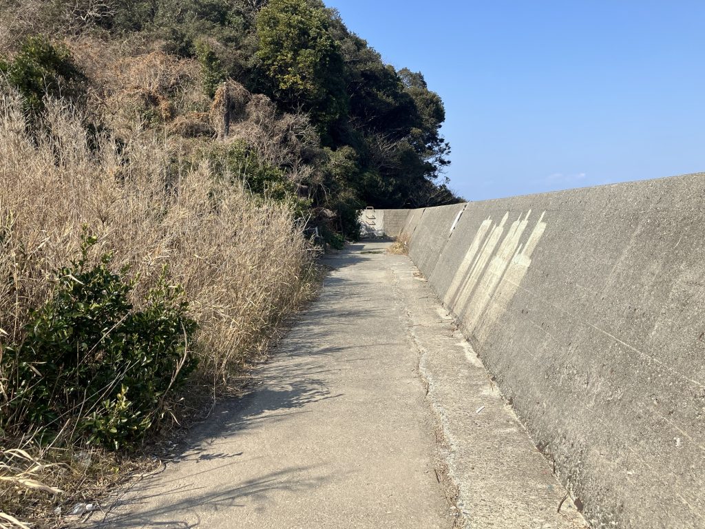石積みの波止に行くにはちょっと歩きます。あのハシゴを登って行けば波止に辿り着きます。