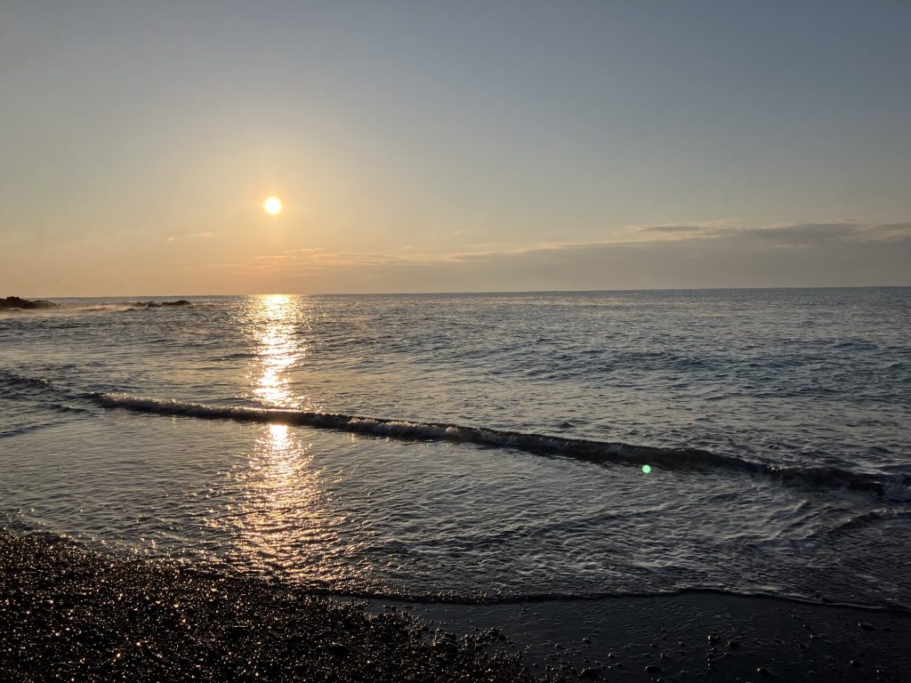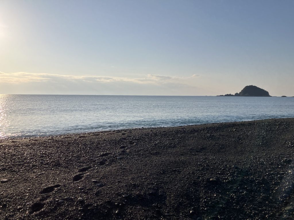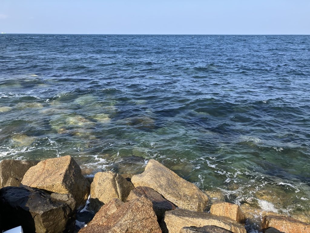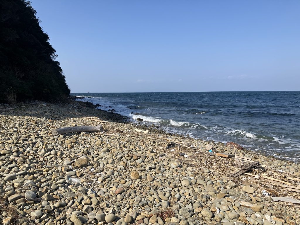 ハシゴを降りると何と何と完全なるゴロタ浜。ここでの釣りはルアー釣り1択になるような場所です。シーバスを狙うも良し。餌木でアオリイカを狙うも良しの好ポイント。